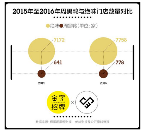 近兩年的市場表現(xiàn)沒有讓潘攀失望。根據(jù)咨詢公司弗諾斯特沙利文的數(shù)據(jù),中國休閑鹵制品零售總額從2010年的232億元增長至2016年的637億元,年均復(fù)合增長率為18.5%。截至2016年12月31日,周黑鴨全年?duì)I收約為28.16億元,較去年同期的24.32億元增長15.8%。雖然778家的門店數(shù)量只有絕味的1/10左右,但周黑鴨的利潤率是絕味的2倍多。