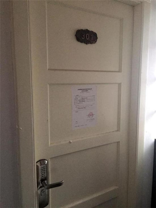 長樂路764弄19號樓3樓,裝著密碼門的就是這間民宿。2樓業(yè)主反復投訴后,城管部門上門檢查時發(fā)現(xiàn)民宿侵占了一部分過道的空間,故城管向業(yè)主下發(fā)了責令改正通知書。圖中貼于門上的,即是城管下發(fā)的通知書。