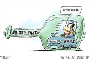 牌照、停車位、充電樁成為制約共享汽車行業(yè)發(fā)展的三大瓶頸,需要各方協同創(chuàng)新以促進產業(yè)可持續(xù)發(fā)展。新華社發(fā) 徐駿/作