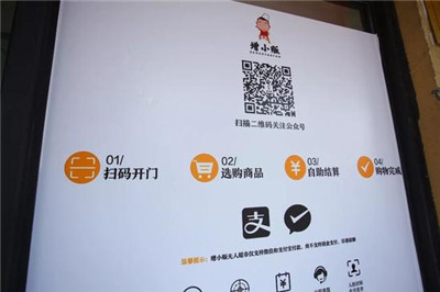 在無人超市的玻璃門上有二維碼,用微信掃描后會提示關(guān)注無人超市公司的二維碼,關(guān)注后下面有“我要開門”的應(yīng)用,點擊獲得一把“鑰匙”就可以開門。