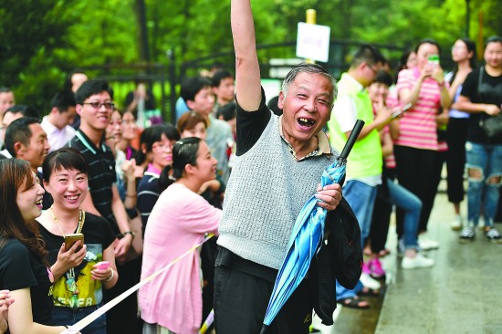 6月8日,一名幼兒家長在合肥森林海幼兒園的抽簽搖號中簽后歡呼。