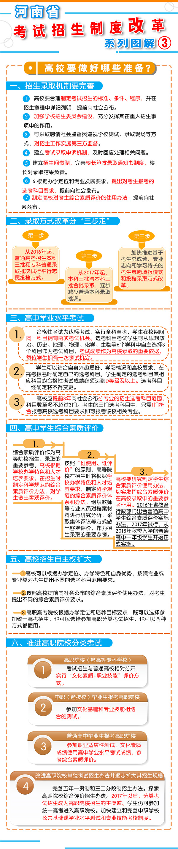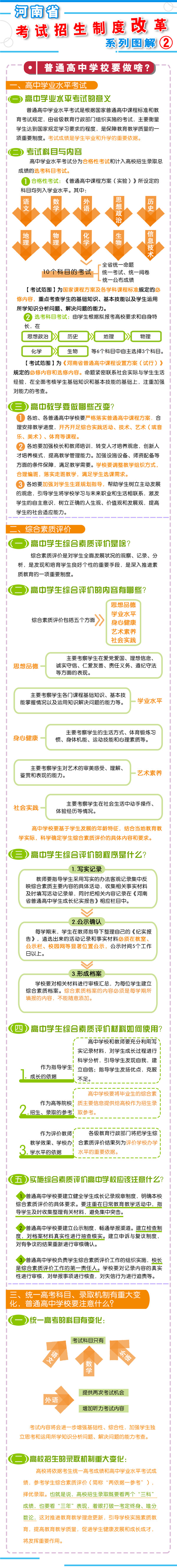 一、促進(jìn)升學(xué)機(jī)會(huì)公平 逐步增加我省考生接受優(yōu)質(zhì)高等教育的機(jī)會(huì),逐步增加農(nóng)村學(xué)生升入重點(diǎn)高校人數(shù),減少和規(guī)范高考加分,完善中小學(xué)招生辦法?! ?strong>二、改革考試形式和內(nèi)容 完善高中學(xué)業(yè)水平考試??荚嚪譃楹细裥钥荚嚭陀?jì)入高校招生錄取總成績(jī)的選考科目考試(簡(jiǎn)稱“選考科目考試”)。合格性考試范圍覆蓋國(guó)家規(guī)定的高中所有學(xué)習(xí)科目的必修內(nèi)容。選考科目由考生根據(jù)報(bào)考高校要求和自身特長(zhǎng),從思想政治、歷史、地理、物理、化學(xué)、生物等科目中自主選擇3科。學(xué)生在校期間,可以參加同一科目的兩次合格性考試、一次選考科目考試?! ∵M(jìn)一步規(guī)范高中學(xué)生綜合素質(zhì)評(píng)價(jià)。建立全省規(guī)范統(tǒng)一的高中學(xué)生綜合素質(zhì)檔案,完善學(xué)生綜合素質(zhì)評(píng)價(jià)電子化管理平臺(tái),客觀記錄學(xué)生成長(zhǎng)過程中的真實(shí)表現(xiàn),確保程序嚴(yán)格、公開透明、內(nèi)容真實(shí)可信。 推進(jìn)高職院校分類考試。高職院校(含高等??茖W(xué)校)考試招生與普通高校相對(duì)分開,實(shí)行“文化素質(zhì)+職業(yè)技能”評(píng)價(jià)方式。中職(含技校)畢業(yè)生報(bào)考高職院校,參加文化基礎(chǔ)和專業(yè)技能相結(jié)合的測(cè)試。普通高中畢業(yè)生報(bào)考高職院校,參加職業(yè)適應(yīng)性測(cè)試,文化素質(zhì)成績(jī)使用高中學(xué)業(yè)水平考試成績(jī),參考綜合素質(zhì)評(píng)價(jià)?! ∩罨荚噧?nèi)容改革。依據(jù)國(guó)家高中課程標(biāo)準(zhǔn)和高校人才選拔、培養(yǎng)要求,科學(xué)設(shè)計(jì)命題內(nèi)容,增強(qiáng)基礎(chǔ)性、綜合性,突出能力、創(chuàng)新導(dǎo)向,著重考察學(xué)生獨(dú)立思考和運(yùn)用所學(xué)知識(shí)分析問題、解決問題的能力?! ?strong>三、改革招生錄取機(jī)制 完善招生選拔機(jī)制。高校要合理確定考試招生的標(biāo)準(zhǔn)、條件、程序等內(nèi)容,在招生章程中詳細(xì)列明并提前向社會(huì)公布。要加強(qiáng)學(xué)校招生委員會(huì)建設(shè),充分發(fā)揮其在重大招生事項(xiàng)中的作用。建立考試錄取申訴機(jī)制和招生問責(zé)制,校長(zhǎng)對(duì)錄取結(jié)果負(fù)責(zé)?! 「母镤浫》绞?。從2017年起,本科三批與本科二批合批錄取,逐步減少普通本科錄取批次,克服簡(jiǎn)單用錄取批次來劃分和評(píng)價(jià)不同類型高校的傾向。加快推進(jìn)基于考生總成績(jī)、專業(yè)志向和學(xué)習(xí)特長(zhǎng)的考生志愿填報(bào)方式和投檔錄取方式改革?! ?strong>四、改革監(jiān)督管理機(jī)制 加強(qiáng)信息公開,全面實(shí)施高校招生“陽光工程”,進(jìn)一步擴(kuò)大信息公開的范圍和內(nèi)容。強(qiáng)化考試安全,堅(jiān)持從嚴(yán)治考,完善考試招生誠(chéng)信制度,落實(shí)誠(chéng)信結(jié)果使用要求。加大違規(guī)查處力度,加強(qiáng)考試招生全程監(jiān)管,嚴(yán)厲打擊和嚴(yán)肅查處考試招生中的違法違規(guī)行為,及時(shí)公布查處結(jié)果,嚴(yán)格責(zé)任追究?! ?strong>五、2018年秋季開始實(shí)施 從2018年秋季入學(xué)的普通高中一年級(jí)學(xué)生開始啟動(dòng)普通高??荚囌猩贫染C合改革?! ≡诟母锟荚嚳颇吭O(shè)置上,不分文理科,外語科目提供兩次考試機(jī)會(huì)。考生的總成績(jī)由統(tǒng)一高考的語文、數(shù)學(xué)、外語(含外語聽力)3個(gè)科目成績(jī)和高中學(xué)業(yè)水平3個(gè)選考科目考試成績(jī)組成。保持統(tǒng)一高考的語文、數(shù)學(xué)、外語分值不變?! ≡诟母镎猩浫C(jī)制上,推進(jìn)基于統(tǒng)一高考成績(jī)和高中學(xué)業(yè)水平考試成績(jī)、參考學(xué)生綜合素質(zhì)評(píng)價(jià)的多元錄取機(jī)制改革。高校要根據(jù)自身辦學(xué)定位和專業(yè)人才培養(yǎng)目標(biāo),提出對(duì)考生高中學(xué)業(yè)水平考試科目要求和綜合素質(zhì)評(píng)價(jià)使用辦法,提前向社會(huì)公布。 2016年省教育行政部門出臺(tái)普通高中學(xué)業(yè)水平考試實(shí)施辦法和普通高中學(xué)生綜合素質(zhì)評(píng)價(jià)實(shí)施辦法,從2018年秋季入學(xué)的普通高中一年級(jí)學(xué)生開始正式實(shí)施?! ?strong>省教育廳文件通知: 1、關(guān)于印發(fā)《河南省普通高中學(xué)業(yè)水平考試實(shí)施辦法(試行)》的通知 2、關(guān)于印發(fā)《河南省普通高中學(xué)生綜合素質(zhì)評(píng)價(jià)實(shí)施辦法(試行)》的通知