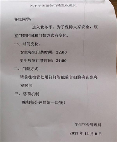 近日,有杭州某高校學(xué)生爆料,杭州某大學(xué)宿舍管理處為管理學(xué)生寢室門禁,引入人臉識別簽到,要求女生在晚上10點(diǎn)前回宿舍,晚到一分鐘罰款1塊錢,而男生竟然可以晚兩小時(shí)。