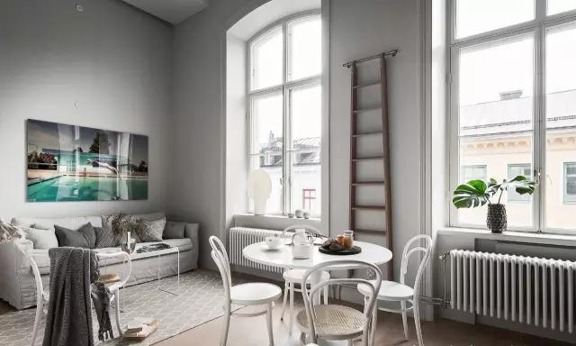 客廳以灰白色為主,大面積的玻璃窗戶讓室內(nèi)顯得格外明亮通透,沙發(fā)在色調(diào)與圖案上做了變化,豐富了空間層次。墻上的一幅藝術(shù)品在視覺上給空間升溫,打破過于沉浸和單調(diào)的感覺。由于整個(gè)空間格外高挑,墻上懸掛的梯子不僅起了裝飾作用,也是日常必備工具。