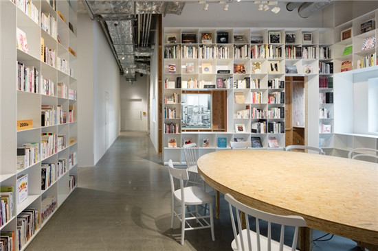 schemata第一次整修的時(shí)候包括有攝影工作室、廚房和餐廳。最近整修包括大型開放式的空白庫??恐鴫Ρ诘陌咨墓褡永镅b滿了書,透過這個(gè)小櫥窗可以看到廚房里面的情景。