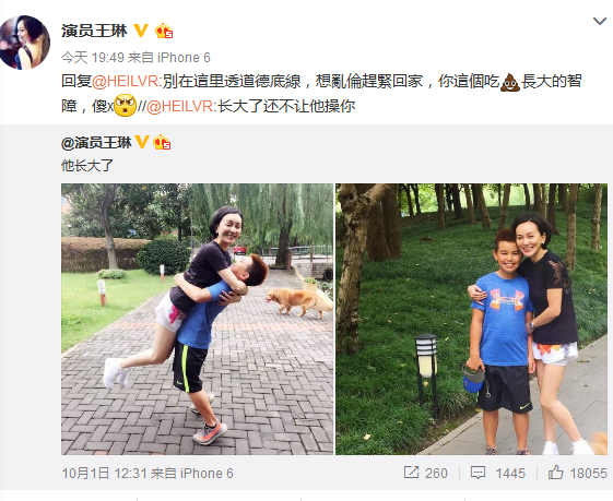 網(wǎng)友看到這一對(duì)高顏值的母子后,紛紛留言表示羨慕,而有網(wǎng)友卻在微博下辱罵到:“長(zhǎng)大了還不讓他x你?!贝藲^評(píng)論也惹怒王琳,并手撕網(wǎng)友回罵道:“別在這里透道德底線,想亂倫趕緊回家,你這個(gè)吃屎長(zhǎng)大的智障,傻x!”