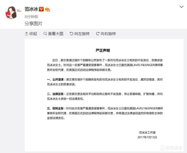 7月13日,范冰冰工作室針對(duì)郭文貴此前發(fā)布的與范冰冰有關(guān)的言論,做出“嚴(yán)正聲明”,并宣布將在美國(guó)啟動(dòng)訴訟程序起訴郭文貴。