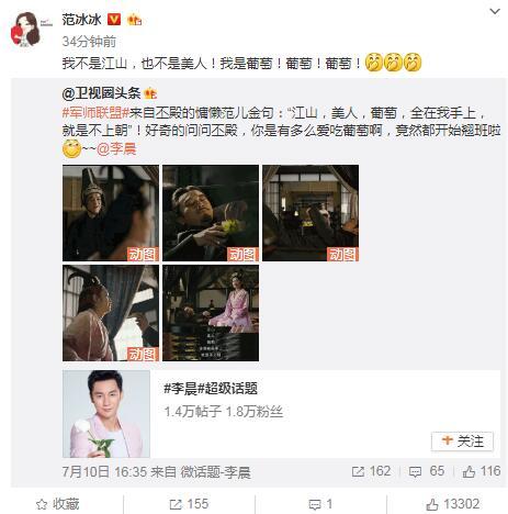 范冰冰看到后,轉(zhuǎn)發(fā)這條微博,還稱自己不是江山、也不是美人,只是一顆葡萄,緊接著一連四個感嘆號,把自己比作李晨愛吃的葡萄,不少網(wǎng)友看到覺得驚呆了,范爺也變得有點(diǎn)污。