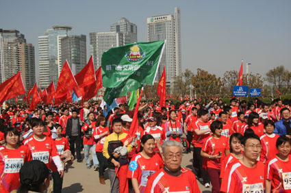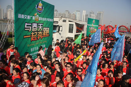 3月27上午,綠城鄭州陽(yáng)光明媚,春意盎然,2011年中國(guó)鄭開(kāi)國(guó)際馬拉松賽分別在鄭州市鄭開(kāi)大道和鄭東新區(qū)商務(wù)內(nèi)環(huán)鳴槍舉行,來(lái)自28個(gè)國(guó)家和地區(qū)的近3萬(wàn)名選手參加了比賽。河南交通廣播也組織了由1041名車友組成的“千人跑友團(tuán)”參賽,大家一起跑進(jìn)春天,共同慶祝交通廣播成立18周年。