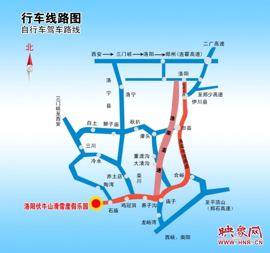 1、 洛陽—洛欒高速—欒川縣下高速—欒川石廟鎮(zhèn)—伏牛山滑雪度假樂園(140公里)