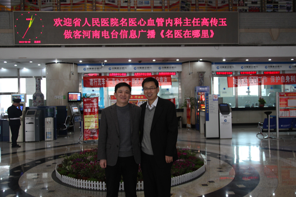 開播第一天做客節(jié)目的嘉賓省人民醫(yī)院心血管內(nèi)科主任高傳玉與河南電臺信息廣播總監(jiān)李金鋒合影