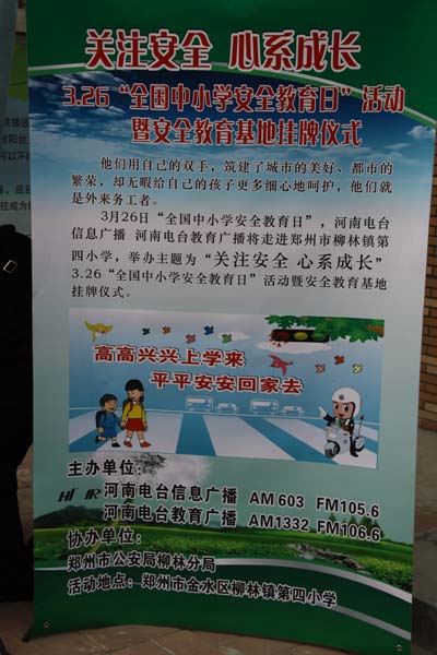 2012年3月26日是第十七個“全國中小學(xué)安全教育日”,在教育日當(dāng)天舉行“中小學(xué)安全教育基地”掛牌儀式,河南電臺信息廣播依托日常欄目《法制新河南》的整合資源,將中小學(xué)安全宣傳教育常態(tài)化。據(jù)河南電臺信息廣播總監(jiān)李金鋒介紹,“教育基地建立以后,河南電臺信息廣播將聯(lián)合鄭州市公安局柳林分局,通過信息廣播AM603、FM105.6廣播頻率,以《法制新河南》欄目為陣地,長期持久的宣傳中小學(xué)安全教育知識,并為柳林鎮(zhèn)第四小學(xué)的學(xué)生提供書籍、器械等安全教育的物品,節(jié)目主持人和柳林分局的警官還將不定期的深入校園內(nèi),跟學(xué)生們面對面的交流、一對一的輔導(dǎo)?!?br />