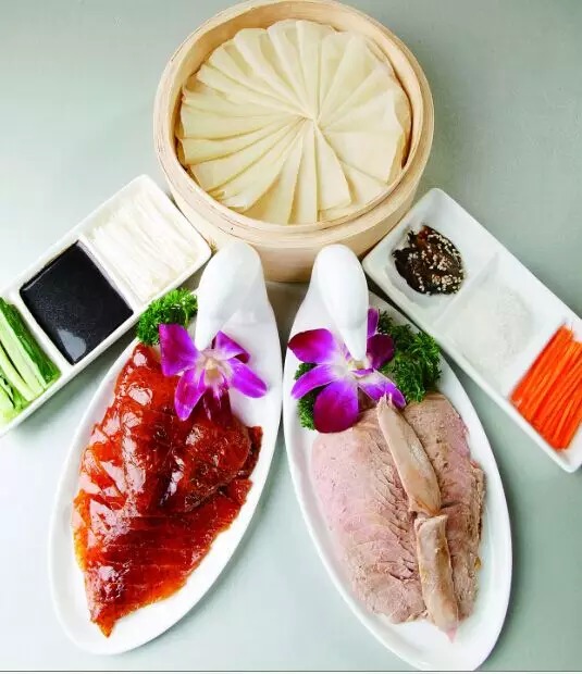 烤鴨號稱天下第一名吃,汴京果木烤鴨色澤紅潤,低脂少油,鴨皮酥松脆嫩而不膩。