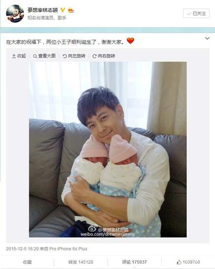 12月5日,林志穎發(fā)微博宣布自己又有了兩個(gè)兒子,眼神里滿是父愛(ài)。陳若儀完勝那個(gè)睡了偶像的妹子好不好,她直接給偶像生了三只猴子!哦不,是三個(gè)兒子。