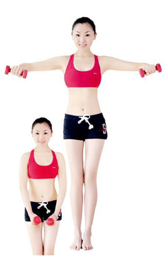 動作要領:雙手握啞鈴放于身體前,膝蓋微微彎曲。手臂慢慢向兩側(cè)抬起呈半圓形,大臂盡量向后靠,注意腕關(guān)節(jié)要低于肘關(guān)節(jié),肘關(guān)節(jié)要低于肩關(guān)節(jié)。返回至初始位置,重復20~30次,每回至少做4組,每組之間要有間隙。