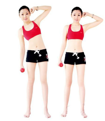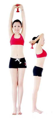 動作要領:雙臂盡量向上伸展,夾緊耳朵,身體拉直。大臂保持不動,小臂彎曲,盡量向下。然后,返回至初始位置。每組動作重復20~50次,每回至少做4組,每組之間要有間隙。