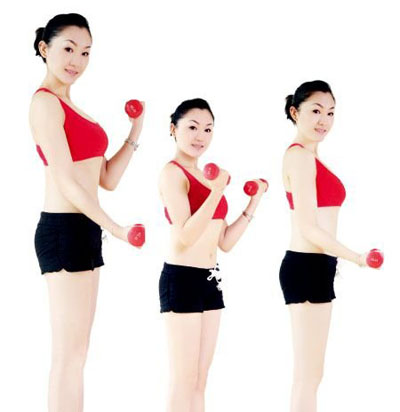 動作要領:收腹、挺胸、沉肩、膝蓋微曲,雙手握啞鈴。大臂夾緊身體,保持不動,小臂抬起,與大臂成30°,保持30秒后,落下小臂,使小臂與身體成30°,再保持30秒。每組動作重復20次以上,每回至少做4組,每組之間要有間隙。