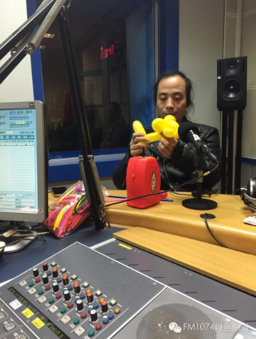 河南電臺(tái)1074綠色頻道直播間,胡耀輝現(xiàn)場(chǎng)做起了氣球玩偶。