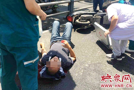 5月27日上午,鄭東新區(qū)平安大道商務外環(huán)路口附近,一年輕男子騎著電動車上班,因為灑水車剛經(jīng)過路面濕滑,男子不慎摔倒著地,頭部重傷造成大量出血。