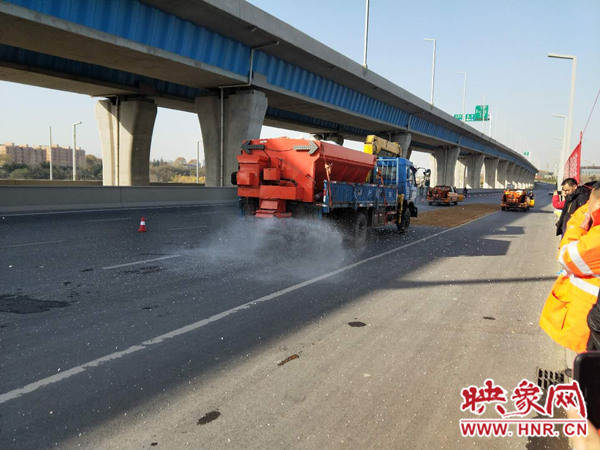 快速路的除雪保潔工作,趙勇總結(jié)為“一融、二鏟、三輥掃、四清運(yùn)”。一融:氣溫在0度以下撒融雪劑。因?yàn)闇囟鹊蜆蛏下访鏁Y(jié)冰,在橋上部分少量食用融雪劑,目的達(dá)到不結(jié)冰。二鏟:將不結(jié)冰的雪鏟到兩側(cè)。三輥掃:雪鏟滾刷清掃積雪。四清運(yùn):人機(jī)配合全面清除殘存冰雪。