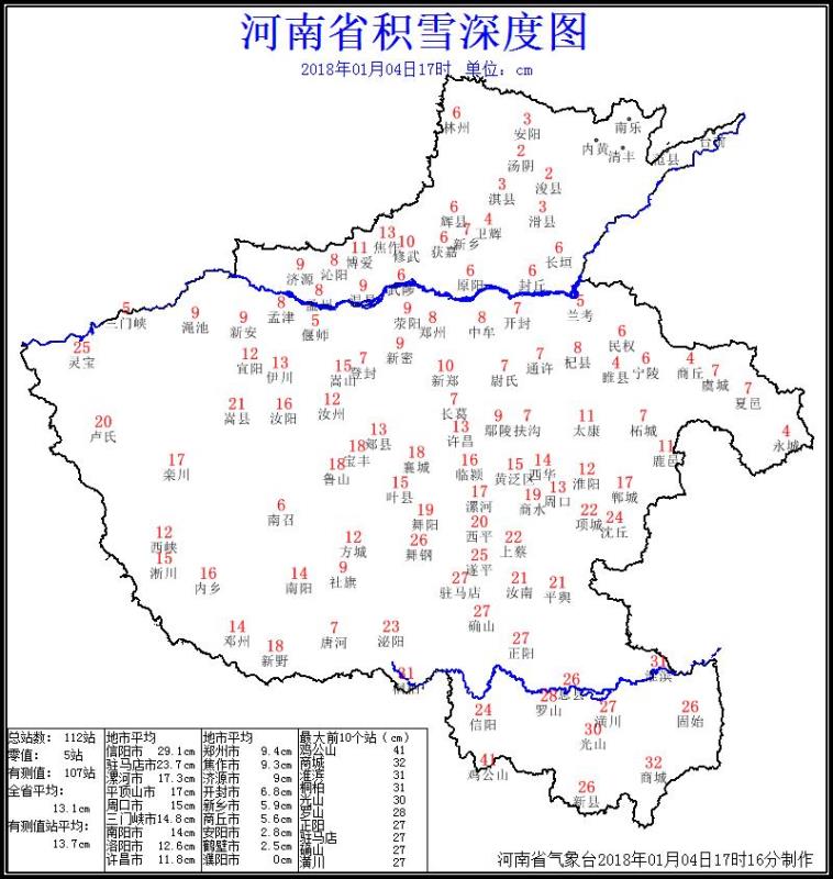 截至4日17時(shí),除東北部外,全省大部的積雪深度普遍在5厘米以上,信陽(yáng)、駐馬店、南陽(yáng)、漯河、平頂山、周口、三門峽、洛陽(yáng)、許昌和焦作大部積雪深度在10厘米以上,信陽(yáng)、駐馬店和周口南部積雪深度多在20厘米以上,最大積雪深度出現(xiàn)在雞公山41厘米(見(jiàn)積雪深度附圖)。