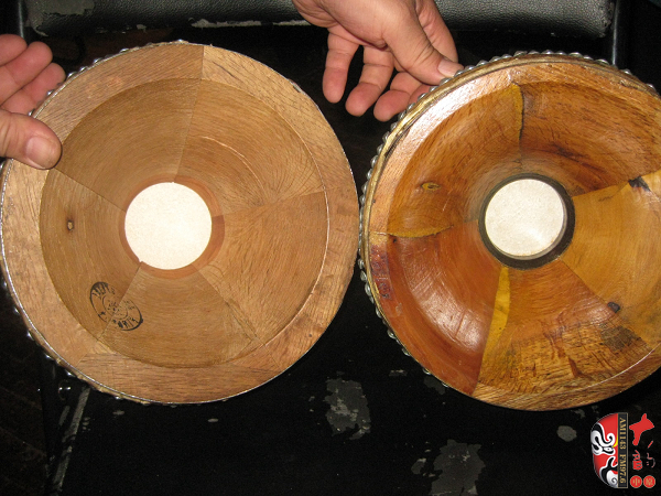 二團(tuán)著名的鼓師石振虎對于板鼓的使用非常講究 左邊是《程嬰救孤》專用的
