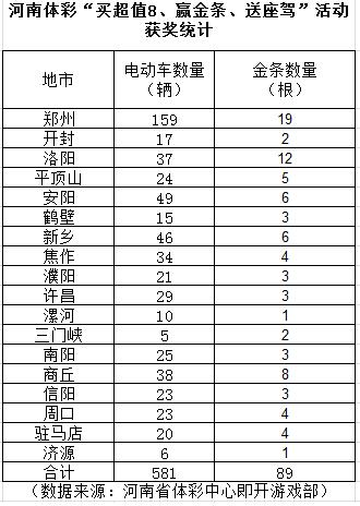 9月份開展“買超值8、贏金條、送座駕”即開型體育彩票促銷活動(dòng)早已圓滿收官,18地市彩民瓜分581輛“座駕”和89根金條!從獲獎(jiǎng)情況看,鄭州、安陽(yáng)、新鄉(xiāng)的彩民中得“座駕”數(shù)量位居前三甲,從獲得金條數(shù)量看,鄭州、洛陽(yáng)、商丘彩民的獎(jiǎng)品含金量則居前。各地市彩民的收獲情況如下: