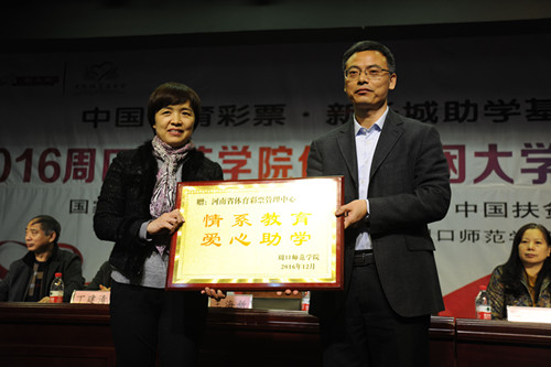2016年12月7日、8日,中國體育彩票品牌公益項目“中國體育彩票新長城助學基金”2016年捐贈儀式分別在商丘師范學院和周口師范學院舉行。據(jù)悉,通過此次捐贈活動,河南省體育彩票管理中心共向兩個學校來自全國14省區(qū)的120名優(yōu)秀貧困大學生每人捐助5000元,幫助他們和他們的家庭,減輕學習生活中的經(jīng)濟負擔。