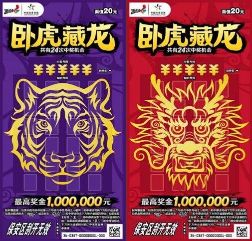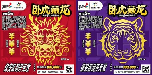 本次上市的“臥虎藏龍”主題即開套票,共有5元、10元、20元三種面值。票面設(shè)計色彩濃郁、霸氣美觀,“虎頭”、“龍頭”標識躍然于票面正中,“眼神”犀利且極富“挑戰(zhàn)”意味,寓意充滿自信,敢于挑戰(zhàn)最高獎金。
