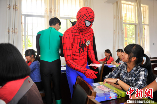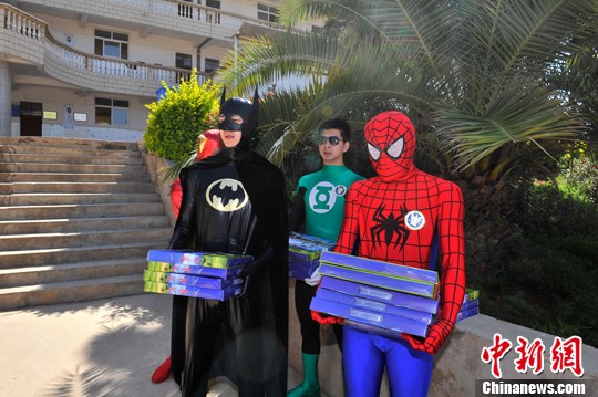 5月29日,在六一兒童節(jié)來臨之際,祥鵬航空的安全員變身超級(jí)英雄,來到云南省昆明市晉寧縣的學(xué)校,為長(zhǎng)期資助的困難學(xué)生送上兒童節(jié)禮物。中新社發(fā) 劉冉陽 攝