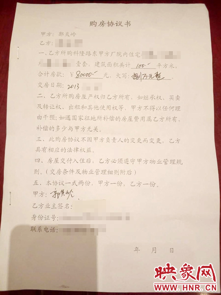 現(xiàn)場(chǎng)的居民向記者出示了當(dāng)時(shí)的一份購房協(xié)議書,房屋售賣甲方的一欄赫然寫著“郭炎嶺”的名字。