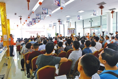 昨天下午1點(diǎn)半,中州大道與柳林東路交叉口西北角上汽車享汽車服務(wù)廣場車享拍鄭州拍賣服務(wù)中心,500名競拍人熱情高漲,等候鄭州第二次公車拍賣正式開始。