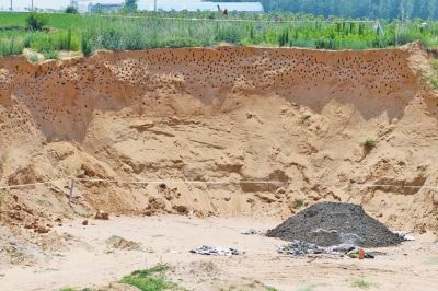 本報(bào)訊崖沙燕筑巢,工地停工保護(hù)。新鄭這一幕人與燕子和諧共處的情景曾被廣泛報(bào)道,但昨天上午大河報(bào)記者在新鄭市一處建筑工地看到,此前人鳥和諧共處的場(chǎng)景已經(jīng)不再,偌大一堆含有刺鼻藥味的垃圾堆在成千上萬個(gè)燕子窩下方,記者在此蹲守近四個(gè)小時(shí),發(fā)現(xiàn)很少有燕子歸巢。