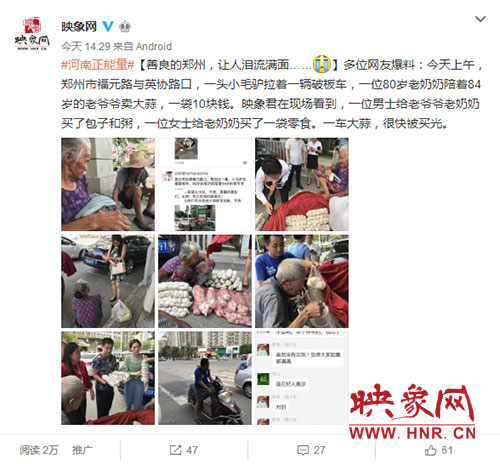 映象網(wǎng)快訊(記者 王寬 趙輝 實(shí)習(xí)生 張璨榮 文/圖)“我能想到最浪漫的事,就是和你一起慢慢變老……”8月23日中午,鄭州街頭上演暖心一幕,年過(guò)八旬的中牟老農(nóng)趕著毛驢車?yán)习檫M(jìn)城賣大蒜,一車蒜被搶購(gòu)一空,卻裝滿了鄭州愛(ài)心市民送的食物。