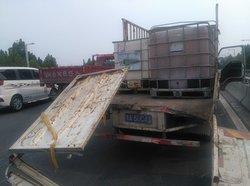 8月27日下午,一輛滿載大醬油桶的貨車,在鄭州市西三環(huán)與中原路交叉口南側(cè)違規(guī)上橋時,因車體超高撞上橋口限高桿,車上的13個方形醬油桶滾落在路中間,嚴重阻塞了交通。