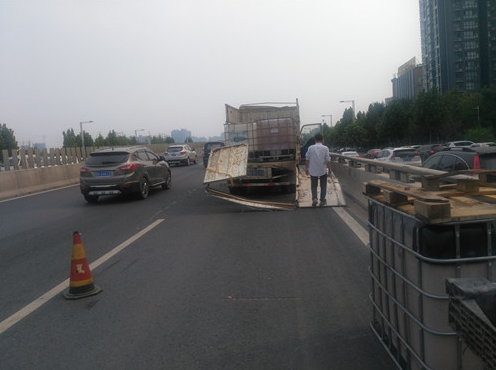 據(jù)貨車司機介紹,他車上拉的這些邊長約1米的方形大桶是裝醬油用的,當天拉著這些空桶從新鄭來到鄭州,因?qū)β窙r不熟,不知道此處上橋口有3米的限高桿,直到上橋時撞上限高桿后,才知道貨車不讓上三環(huán)立交橋。