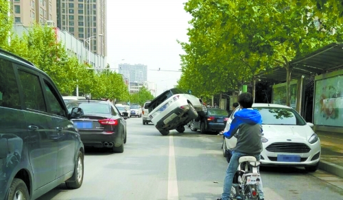 昨日上午10點20分,鄭州興華南街南三環(huán)公交站臺發(fā)生的一幕引起眾人圍觀:一輛路虎車“騎”在奧迪車上。