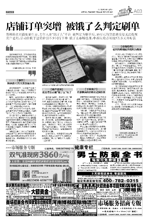 4月16日,《河南商報(bào)》以《店鋪訂單突增 被餓了么判定刷單》為題,對(duì)老劉10萬(wàn)多元的交易款被凍結(jié)一事進(jìn)行報(bào)道,“餓了么”市場(chǎng)經(jīng)理潘先生稱,因?yàn)檫B續(xù)多天多個(gè)手機(jī)號(hào)在老劉店鋪下單,系統(tǒng)判斷為商家刷單,套取“餓了么”給用戶的補(bǔ)貼,所以將老劉的賬戶貨款凍結(jié)了。