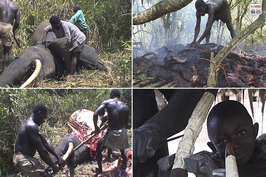 組圖為當(dāng)?shù)貢r(shí)間2007年5月3日,一名野生動(dòng)物攝影師偷拍到非洲偷獵者獵殺大象象牙和肉的畫面。圖左上為偷獵者在槍擊完大象之后使用割刀割下大象的肉;左下為偷獵者使用棍子準(zhǔn)備獲取象牙;右上為偷獵者熏烤割下的大象肉;右下為偷獵者展現(xiàn)獲得象牙。AP Photo/Courtesy Karl Amman