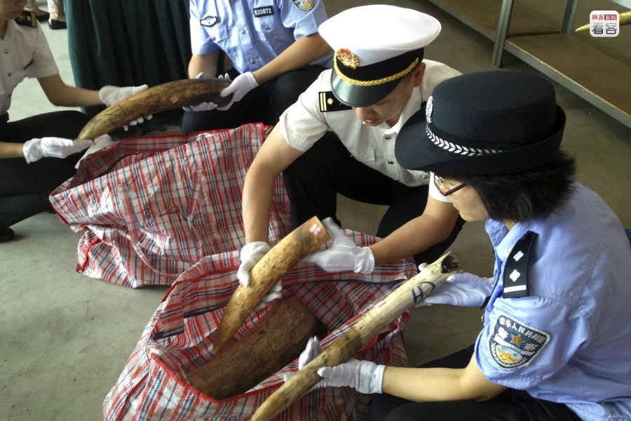 2013年6月19日,廣東東莞,黃埔海關(guān)監(jiān)管倉(cāng)庫(kù)內(nèi),警察在清點(diǎn)一走私團(tuán)伙裝在蛇皮袋里的走私象牙。該團(tuán)伙首先在非洲購(gòu)買象牙,然后以海運(yùn)方式將走私象牙夾藏在紅豆、廢塑料等貨物中,瞞報(bào)進(jìn)口至香港,并伺機(jī)用摩托艇分批從香港海上偷運(yùn)走私至內(nèi)地銷售,構(gòu)成“非洲購(gòu)貨—香港中轉(zhuǎn)—偷運(yùn)闖關(guān)—國(guó)內(nèi)販賣”的完整走私鏈條。CFP