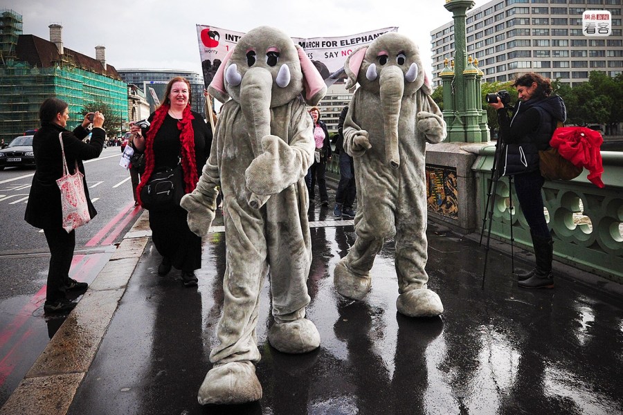 圖為當(dāng)?shù)貢r(shí)間2013年12月4日,英國(guó)倫敦,示威者身穿大象服參加游行,抗議全球的象牙貿(mào)易。AFP PHOTO/CARL COURT
