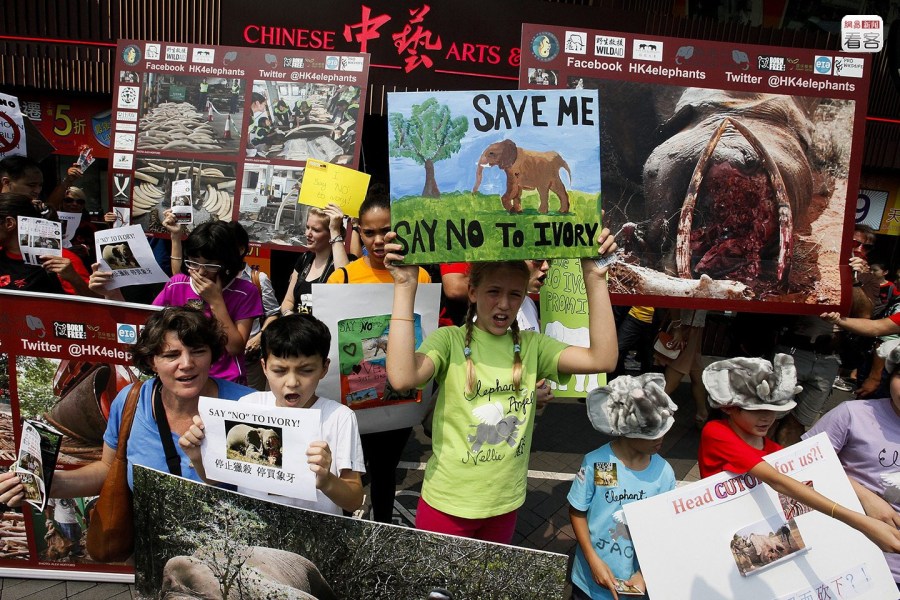 2013年10月4日,香港,示威者在一家販賣象牙制品的商店外呼吁香港政府銷毀境內(nèi)一切象牙及象牙制品。ALEX HOFFORD/CFP