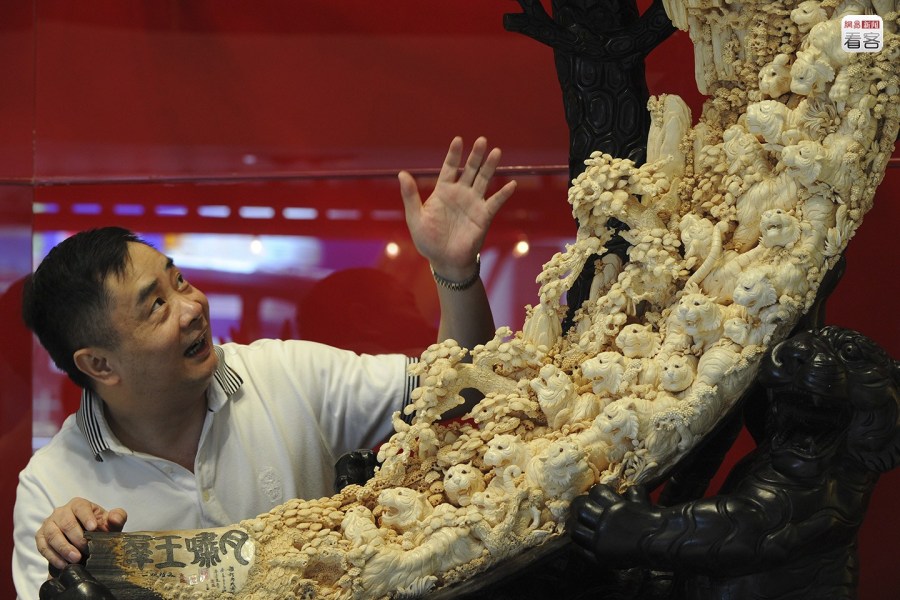 與國(guó)際呼聲背道而馳的是中國(guó)收藏家對(duì)象牙雕刻作品的狂熱。象牙作為一種雕刻的原料,再加上精細(xì)的雕工,所制成的工藝品往往成為收藏家們爭(zhēng)相收藏的對(duì)象。圖為當(dāng)?shù)貢r(shí)間2010年7月14日,香港,一名象牙雕刻師展示他的猛犸象牙雕刻作品。AFP PHOTO/MIKE CLARKE