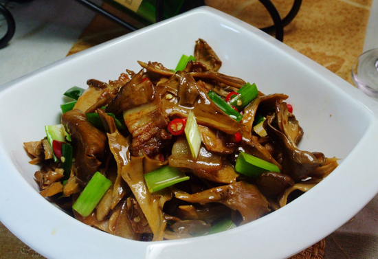青松翠柏牛肝菌是用昆明特有的虎皮青椒,也就是云椒烹制的,肉厚味清香。在牛肝菌過(guò)油變色后立即加入云椒塊,大火爆炒,換小火加適量鹽即可出鍋。幾乎沒(méi)有其他調(diào)味料,純粹考驗(yàn)食材的鮮香本味——醬香和清香相輔相成,天然去雕飾。