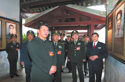 10月31日上午,習(xí)近平帶領(lǐng)全體中央軍委委員一起參觀會(huì)址。習(xí)近平來到當(dāng)年毛澤東作政治報(bào)告的廳堂,凝望著廊柱上富有鮮明戰(zhàn)斗性的標(biāo)語(yǔ),注視著當(dāng)年會(huì)議代表取暖留下的斑斑炭火印跡,同大家一起回憶先輩們探尋革命道路時(shí)篳路藍(lán)縷、艱辛奮斗的情景,并向大家介紹他每次來古田參觀的情形和感受。