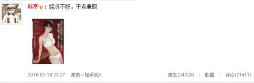 1月16日晚,韓寒在微博曬出一張與自己撞臉的女優(yōu)的照片,并寫道:“經(jīng)濟不好,干點兼職。看到照片后網(wǎng)友紛紛留言調(diào)侃,“帥,不解釋”、“你把岳父甩開幾條街”、“岳父的發(fā)卡好好看”、“岳父從硬漢到軟妹的蛻變”。