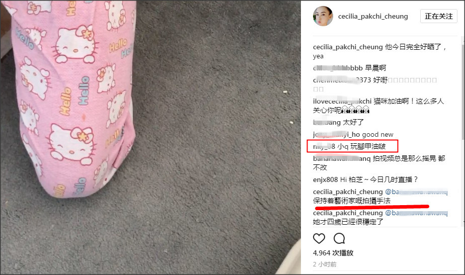 最后喂完貓后張柏芝拿起手機(jī)拍攝,這時候貓?zhí)搅诵的腳上。在鏡頭里面我們意外發(fā)現(xiàn)小Q的腳趾甲全部都涂了腳指甲油,而且顏色還是非常亮眼的粉紅色,看來小Q內(nèi)心保持著一顆少女心啦。