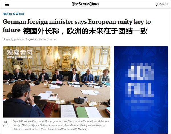 據(jù)美國《西雅圖時(shí)報(bào)》30日?qǐng)?bào)道,德國外長加布里爾在巴黎出席一次駐外使節(jié)會(huì)議上,呼吁歐洲應(yīng)當(dāng)團(tuán)結(jié)一致,制定出統(tǒng)一的對(duì)華戰(zhàn)略,也敦促中國不要試圖分化歐洲,而應(yīng)遵守“一個(gè)歐洲”原則。