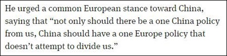 他說:“不能只是要求我們堅(jiān)持一個(gè)中國原則;中國也應(yīng)當(dāng)堅(jiān)持一個(gè)歐洲的立場,不能試圖分裂我們。”