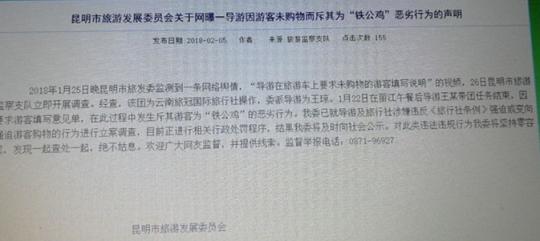 近日,網(wǎng)傳云南一導(dǎo)游斥未購(gòu)物游客為“鐵公雞”,引發(fā)關(guān)注。昆明市旅發(fā)委稱,2018年1月25日晚昆明市旅發(fā)委監(jiān)測(cè)到一條網(wǎng)絡(luò)輿情,“導(dǎo)游在旅游車上要求未購(gòu)物的游客填寫說(shuō)明”的視頻,26日昆明市旅游監(jiān)察支隊(duì)立即開展調(diào)查。